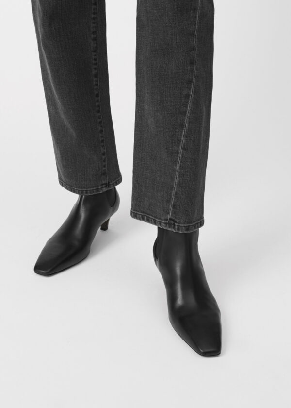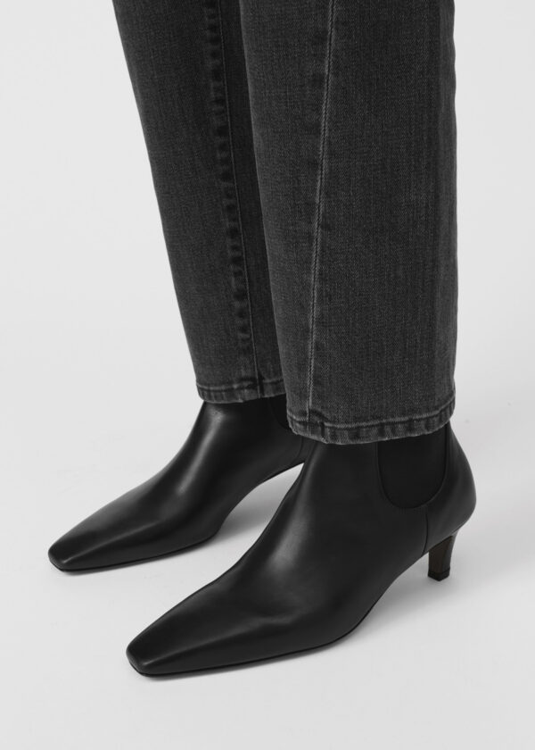 Totême ankle boots made in Italy from Italian calf leather. They are shaped to a sleek silhouette with Totême’s signature squared pointed toe, an elongated shaft with elasticated panels, and a leather-covered heel. Wear through fall with your favorite denim.