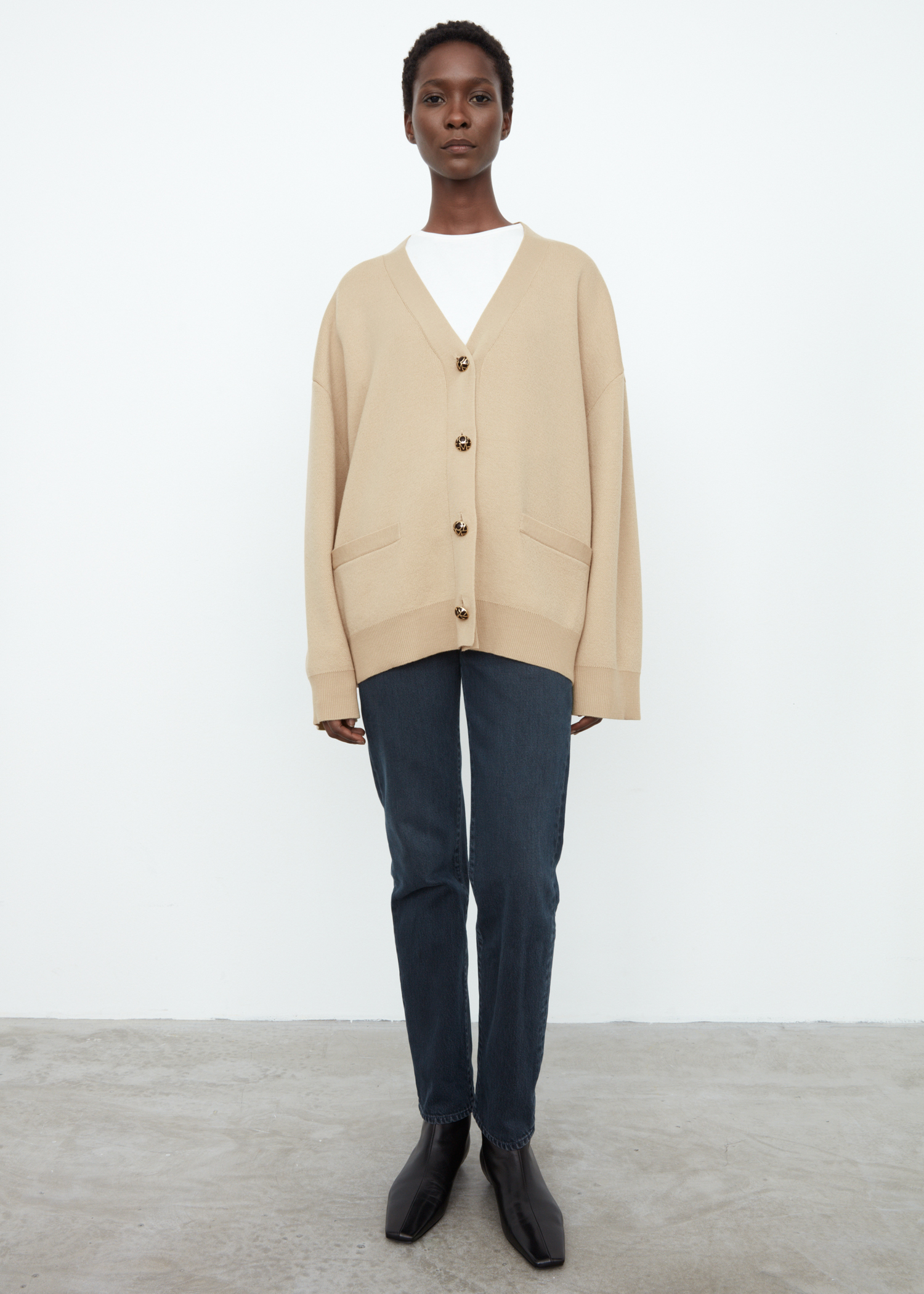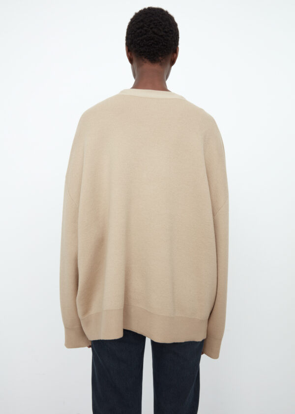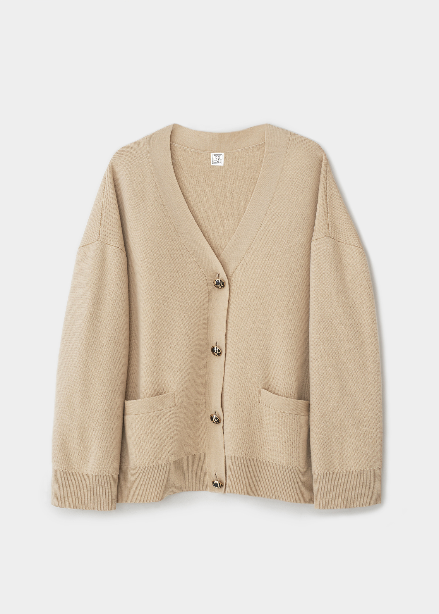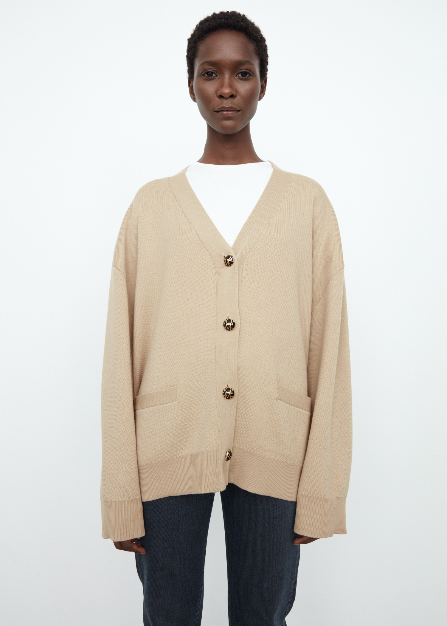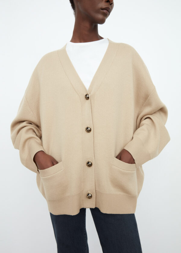 Oversized cardigan cut from a soft merino wool fabric. It’s shaped to a relaxed silhouette with a v-neck, drop shoulders, and wide cuffs, and is finished with golden monogram buttons. Wear over a tee everyday or a dress to dinner.